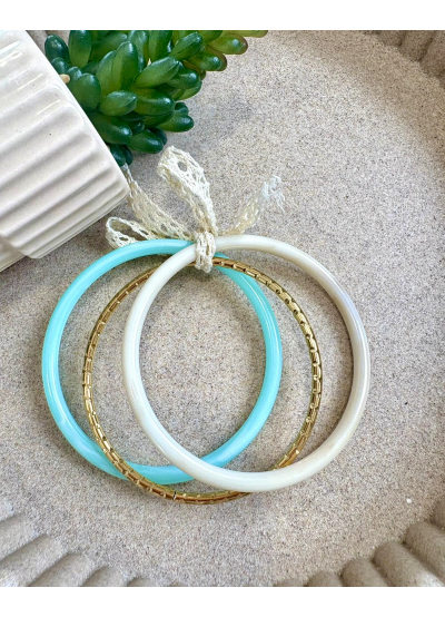 Lot de 3 joncs, 2 en plastiques turquoise et crème et 1 en acier inoxydable or